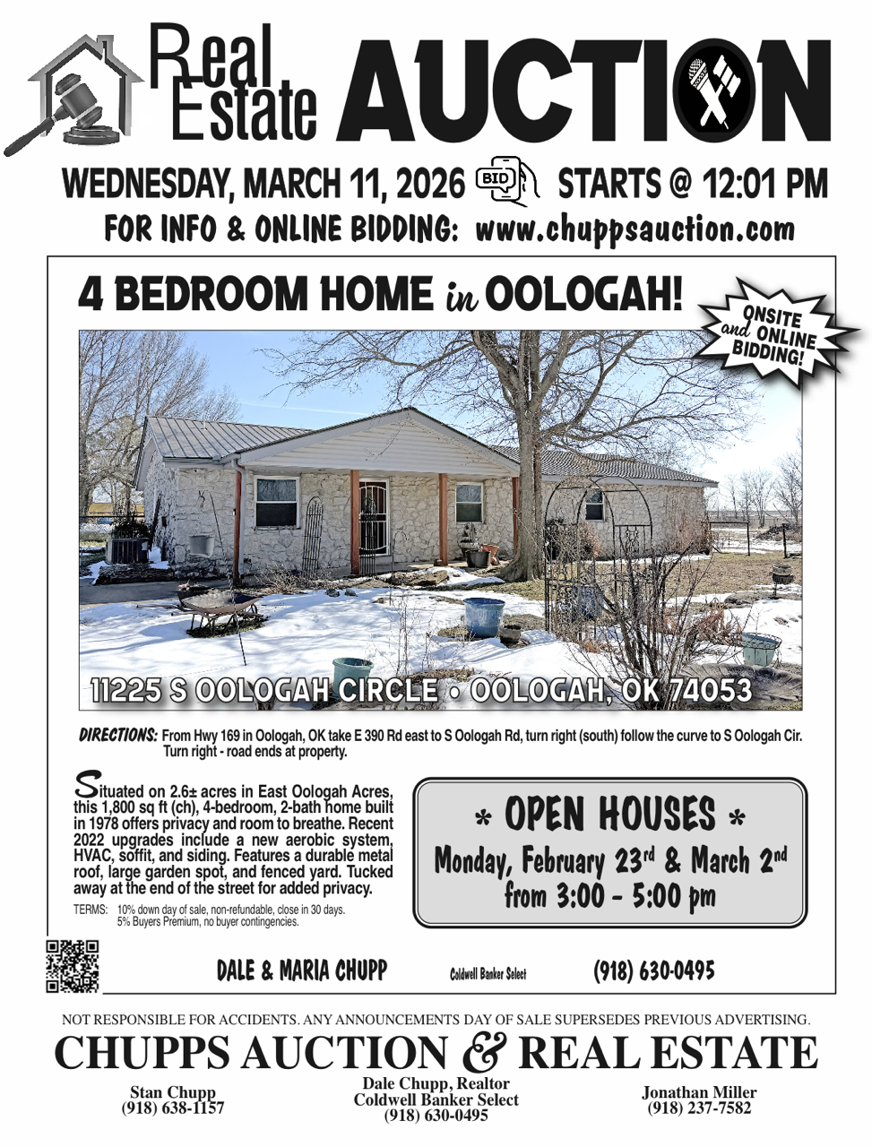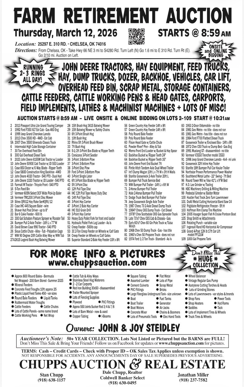 Welcome to Chupps Auction Company in Oklahoma! Search above to find estate sales, real estate auctions, public auctions, and other types of estate liquidations in your area. Become a subscriber to receive free weekly updates about sales near you.
