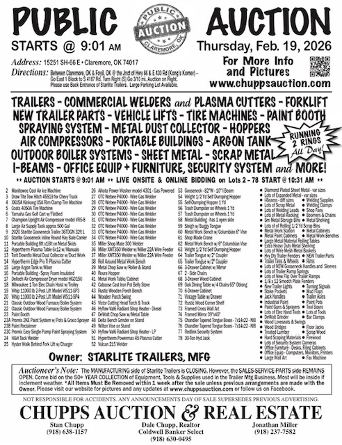 Click Here for Sale Flyer Click Here for Online Bidding Directions: Between Claremore, OK & Foyil, OK @ the Jnct of Hwy 66 & E 430 Rd (Kong’s Korner) – Go East 1 Block to S 4187 Rd. Turn Right (S) Go 3/10 mi. Auction on Right. Please use Back Entrance of Starlite Trailers. Large…